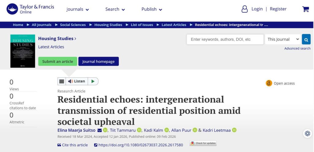 International research on intergenerational housing inequality generally confirms the influence of different forms of parental capital and housing practices on children’s housing careers in adulthood. However, the transmission of residential inequality across major societal upheavals has not previously been examined. The study was completed in cooperation between two Estonian Centres of Excellence in research: the Centre of Excellence in Well-being Sciences (EstWell) and the Centre of Excellence in Energy Efficiency (ENER).